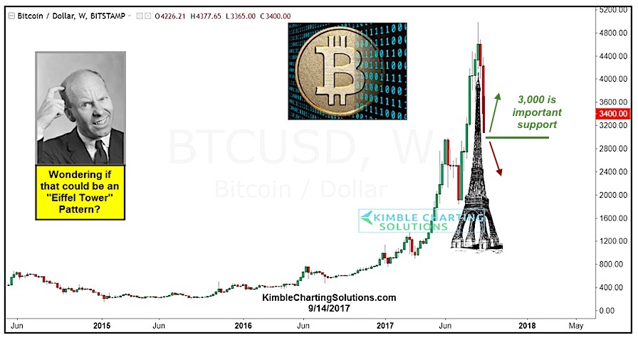 Bitcoin has been running red-hot in 2017. Within its move higher, there have been some sharp, volatile pullbacks. Managing risk is important so it may be wise for traders to watch the recent lows (Friday, around $2950). They will tell us if this was just another steep pullback… or if something more ominous like an Eiffel Tower pattern is playing out.