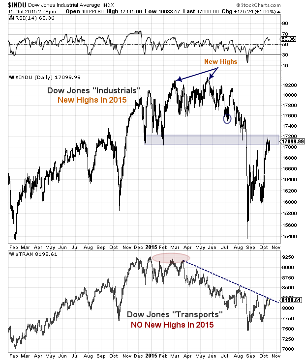 This non-confirmation (divergence) came into play this past spring and sent a very cautionary message to investors about stocks. Â For those that aren’t familiar, the Dow Jones Industrial Average made new highs in 2015, while the Dow Jones Transportation Average did not. In March, I wrote a post about the non-confirmation and why it was worrisome. Â In that post, I also showed how a similar Dow Theory non-confirmation (divergence) played out in 2012.