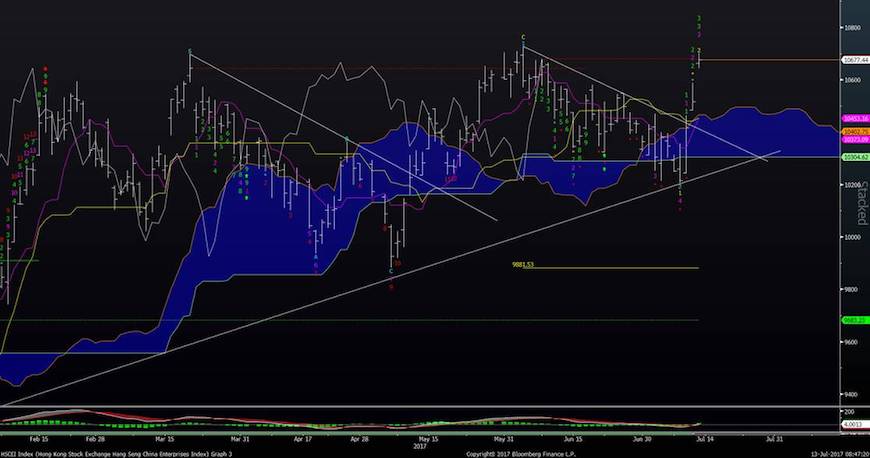 2.  HSCEI China’s Hang Seng China Enterprise Index moving back to early June highs after 4 sharp days of gains.