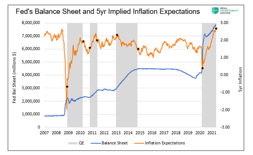 As shown below, QE 1 was accompanied by a 3% spike in inflation expectations, albeit from negative territory. Likewise, QE 2 saw expectations rise while they fell during QE3.
