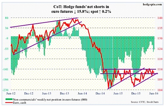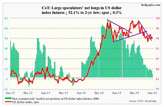 Non-commercials continue to cut back net longs, with holdings at two-year lows.