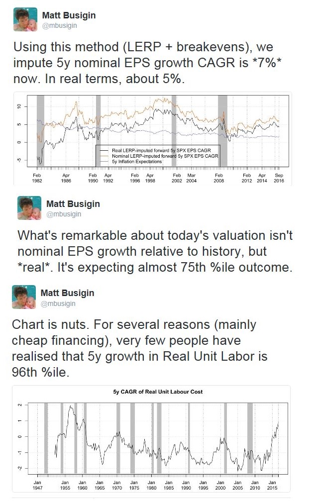 What about fundamentals? Based on Busigin’s analysis, the market is pricing in real EPS growth of 5%, which is roughly 75th percentile of historical experience. But real unit labor costs is in the 96th percentile. The Fed is about to embark on a rate hike cycle, something has to give.