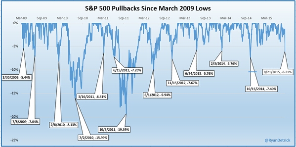 After the worst weekly sell-off in years, let’s take step back and put the recent stock market correction into perspective. First off, as of a week ago, the S&P 500 was about a percent away from a new high, and as of Friday’s close it is more than seven percent away. That happened fast! And considering today’s morning trade, the S&P 500 has now dipped into correction land (it’s been volatile so we’ll see how the day closes out).