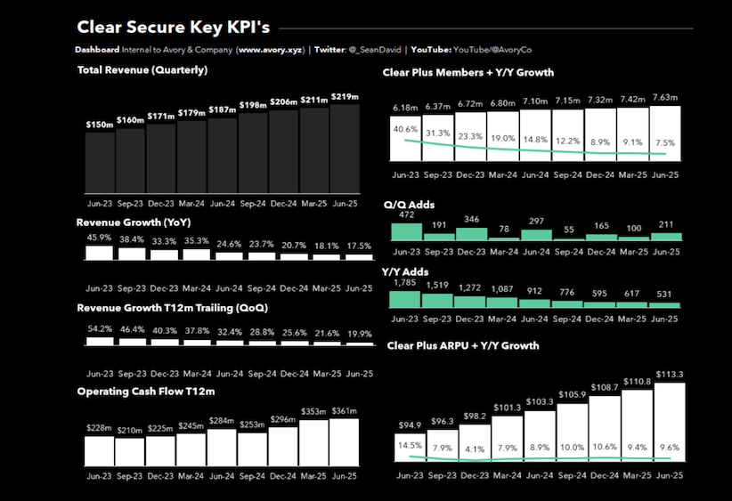 Their core airport business continues to expand, but they also posted a record quarter for non-airport deals through ClearOne. Margins remain strong, with $361M in trailing 12-month operating cash flow. Revenue is growing in the mid-teens, and they now have 7.63M Clear Plus members.