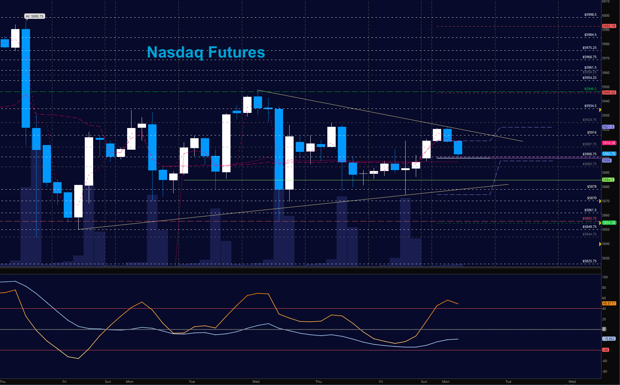 The weak wedge continues to build – with higher lows and lower highs, in general. Resistance sits near 5921.75 and then above at 5934.5. Support regions sit near 5890-5877. Momentum remains mixed but charting a bit lower- suggesting support tests likely off spikes higher. Watch for resolution of price above 5900 to give buyers some advantage. The bullets below represent the likely shift of intraday trading momentum at the positive or failed tests at the levels noted.