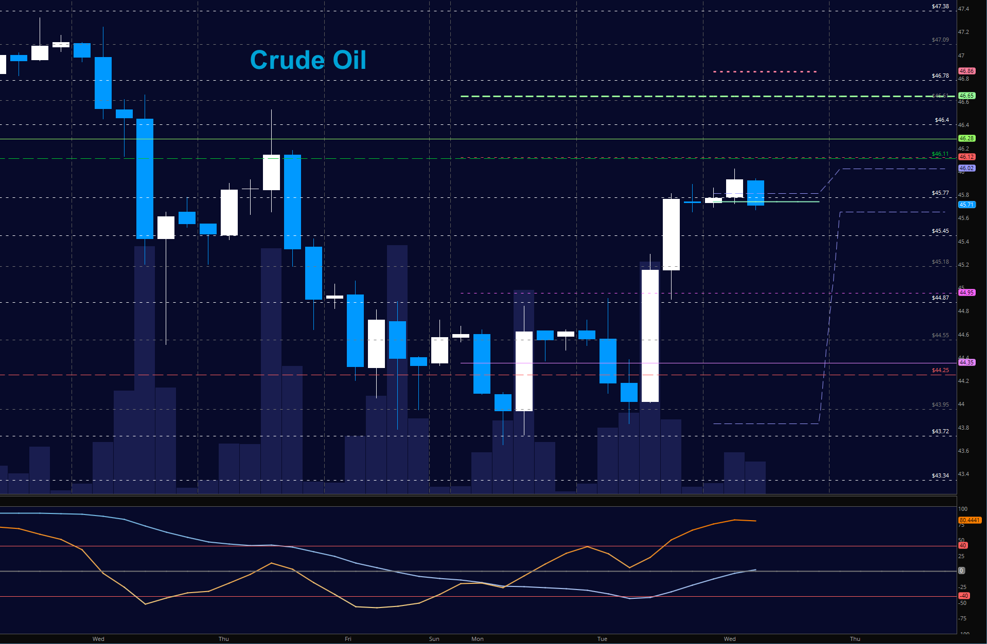 Oil has spiked into resistance near 46.14. The chart is looking bullish but going long on the breaches seems a bit dangerous. I’ll be looking for a failure to breach new highs to signal a potential reversal on the horizon. The bullets below represent the likely shift of trading momentum at the positive or failed tests at the levels noted.