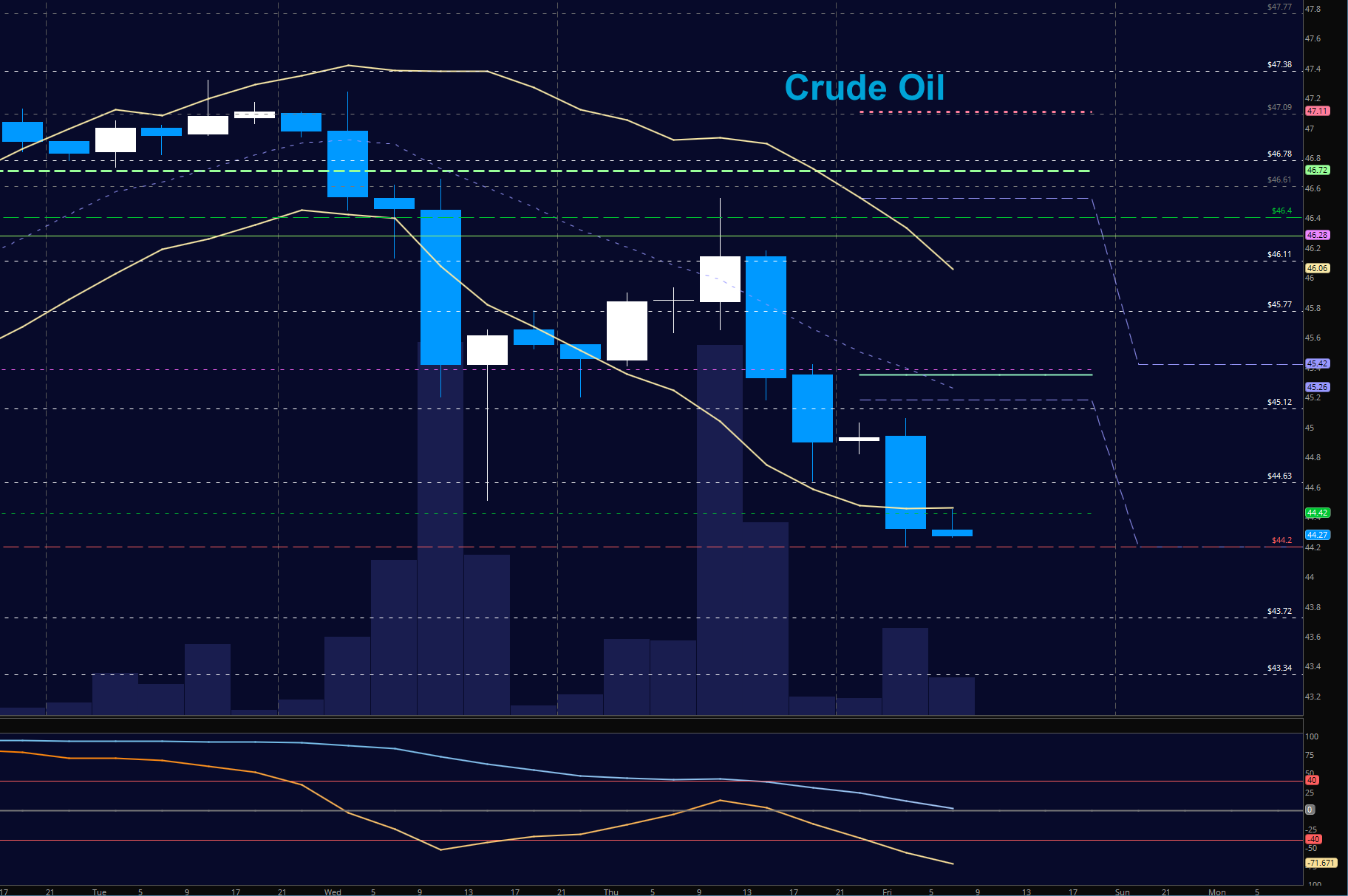 After a hopeful bounce from traders into the 46.11 area and above, oil resumed its downward motion. Momentum is mixed, but the formation still shows that bounces will find sellers. I continue 44.2 very important here so I do expect to see a battle ensue. The bullets below represent the likely shift of trading momentum at the positive or failed tests at the levels noted.