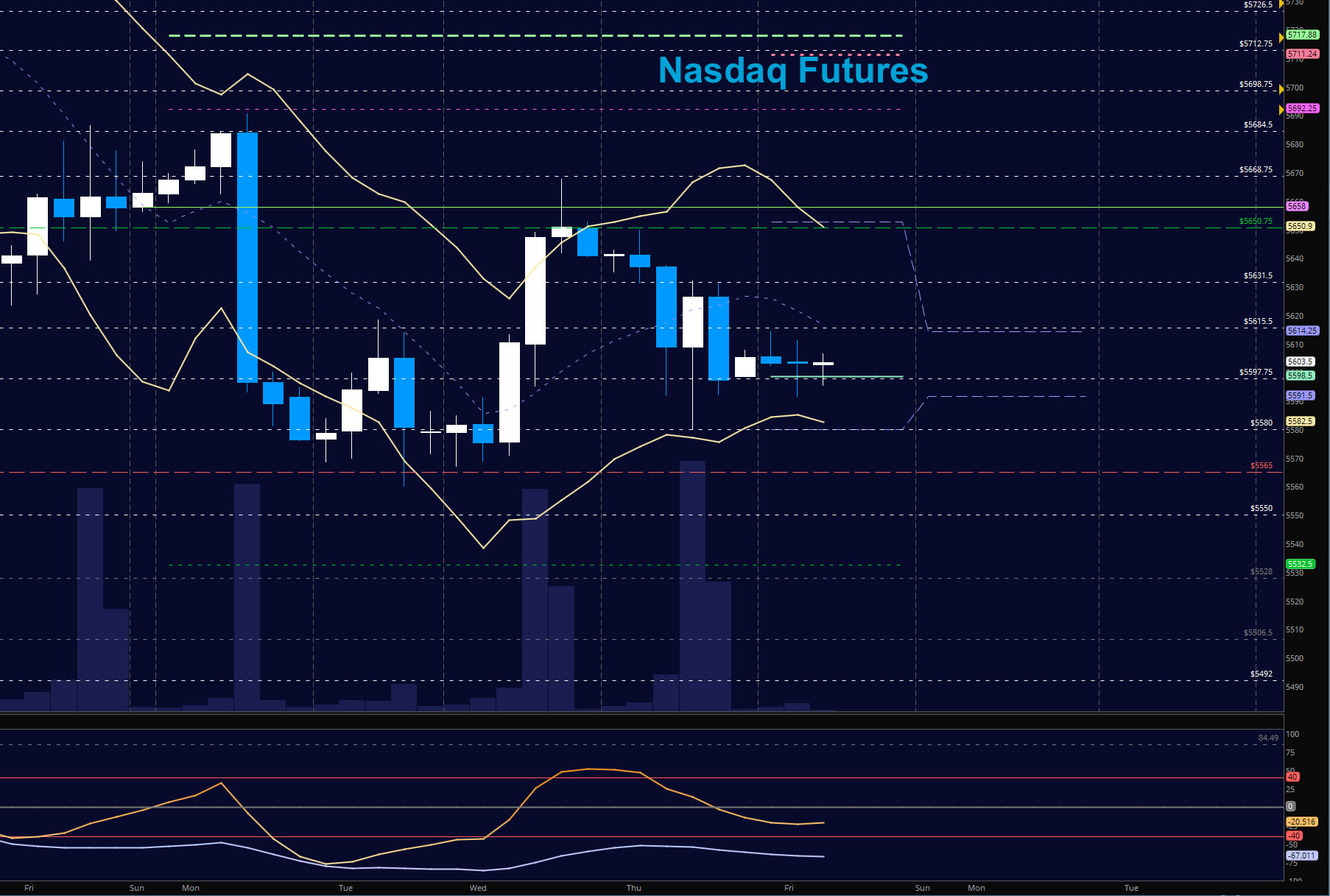 Though the negative backdrop continues, this chart has held its lows from yesterday. A tight pattern of congestion and a drift of sideways momentum is present. Support levels are lower and near 5565, but I still have eyes on the mark near 5454 – a breakaway event with a gap just above. Resistance appears to be near 5650.75 today. The bullets below represent the likely shift of intraday trading momentum at the positive or failed tests at the levels noted.