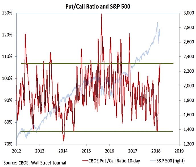 Short-term sentiment indicators reacted quickly to the February stock market weakness. Since January, the 10-day CBOE put/call ratio has surged from its lowest level since 2014 to its highest level since late 2016. In fact, this ratio is one of the few sentiment indicators we track that shows outright and excessive pessimism. There are two caveats here: in the past, significant peaks in the put/call ratio have been well above current levels, and while overall demand for puts relative to calls has been robust, the equity put/call ratio has not shown the same level of concern in recent trading sessions (recording three consecutive readings below 60% this week).