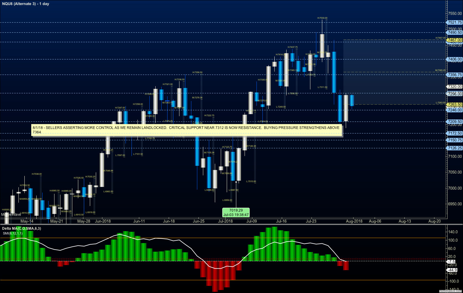 Buyers are struggling to recapture strength as fades into support holds.  The level near 7260 is now a battleground between buyers and sellers from an intraday perspective. Traders are still working through the thin volume profiles but holding the regions that still give buyers a shot at keeping wider bullish time frames intact. Swing traders need to wait for this to settle out before taking long trades as thin volume profiles still deep in the territory all the way down to 7089. The bullets below represent the likely shift of intraday trading momentum at the successful or failed retests at the levels noted.