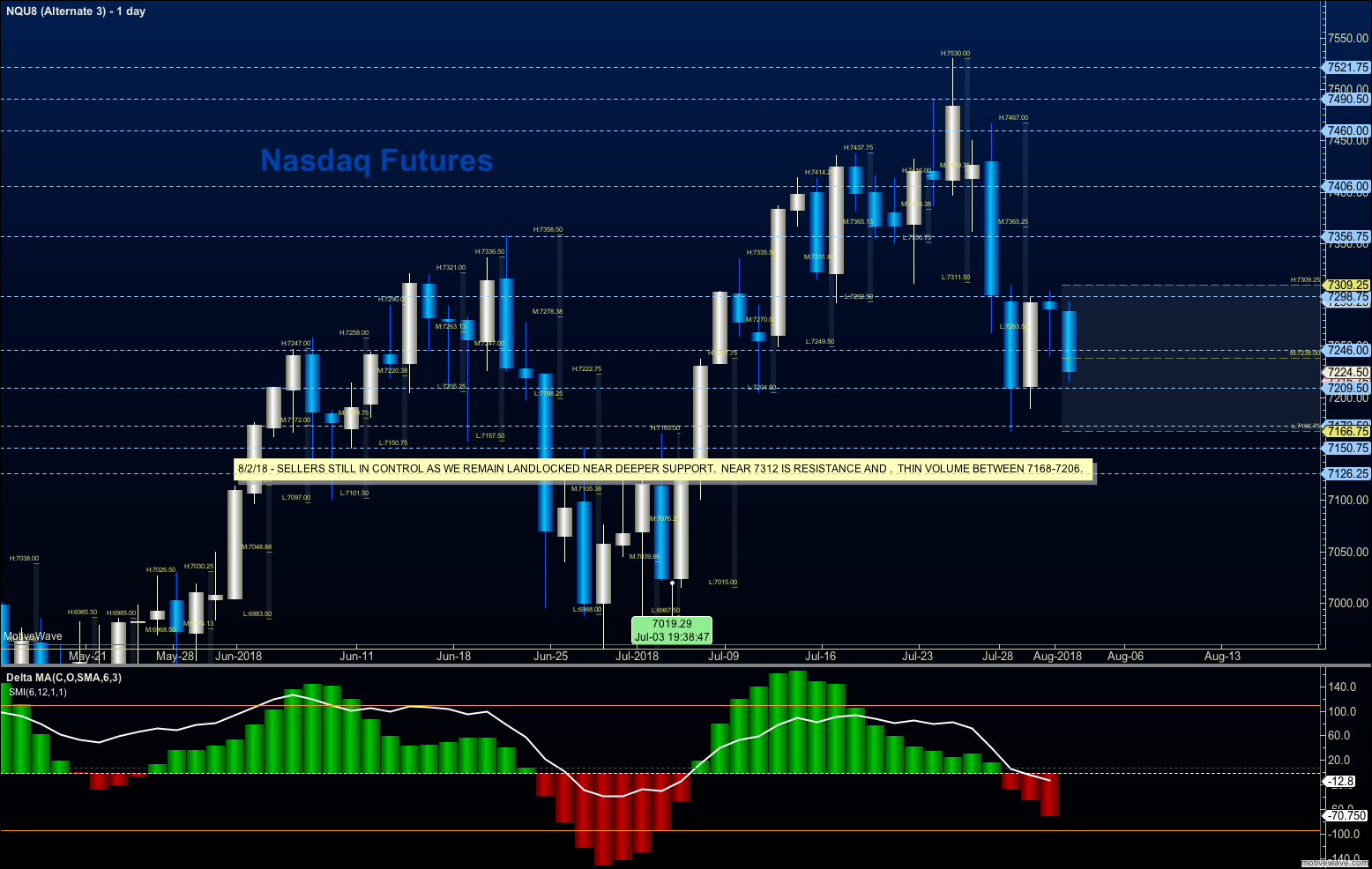 Battle waging between buyers and sellers near 7222-7225 this morning. Traders are still working through the thin volume profiles but holding this area and building volume here is a good thing. Swing traders need to wait for this to settle out before taking long trades as thin volume profiles still deep in the territory all the way down to 7089. The bullets below represent the likely shift of intraday trading momentum at the successful or failed retests at the levels noted.
