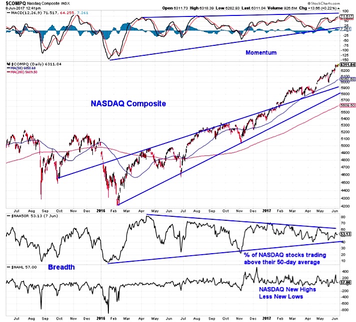 New price highs for the NASDAQ Composite have come without confirmation from momentum and with only about half the stocks (53%) trading above their 50-day averages. This lack of support could leave the index vulnerable to near-term consolidation as price appears to have gotten over-extended.