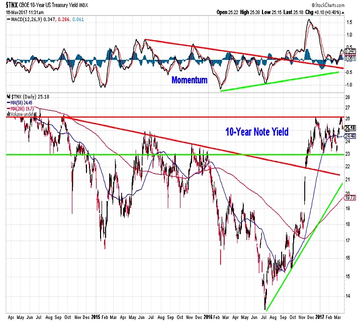 Bond yields appear poised to move higher. Momentum trends for the 10-year T-Note yield have continued to improve even as yields themselves have been largely range-bound (between 2.30% and 2.60%).