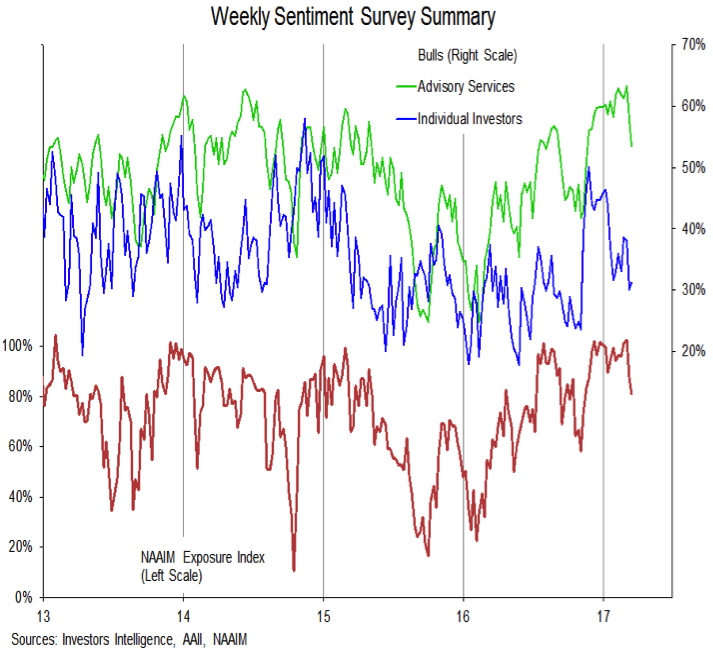 The sentiment surveys over the past two weeks suggest that excessive optimism has peaked and is now beginning to reverse. Historically this would be a period of increased risk for stocks as the crowd is reversing at an extreme. Advisory service bulls (as measured by Investors Intelligence) have retreated from a 30-year high and the active investment managers are reducing equity exposure (the NAAIM index has dropped from 102% to 81% over the past two weeks). Now we will be watching for evidence that pessimism is rising. This could first show up in the options data, but we would also expect to see a meaningful uptick in bears (and further reduction in equity exposure) in these surveys.