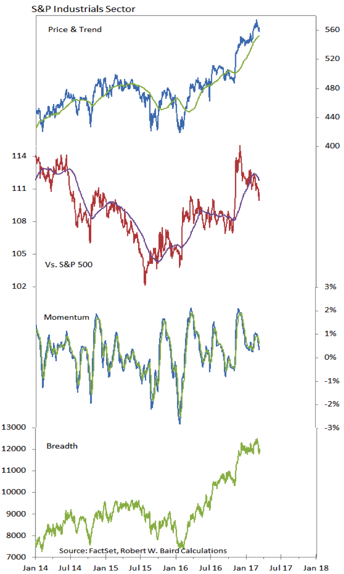 The Industrials sector remains in the relative strength leadership group in our sector-level relative strength rankings, but on a short-term basis the sector has given up ground relative to the S&P 500. The most recent rally to new highs for the sector was not accompanied by new highs in momentum or the relative price line. While breadth remains positive, the sector could be poised for further relative consolidation before re-assert leadership.