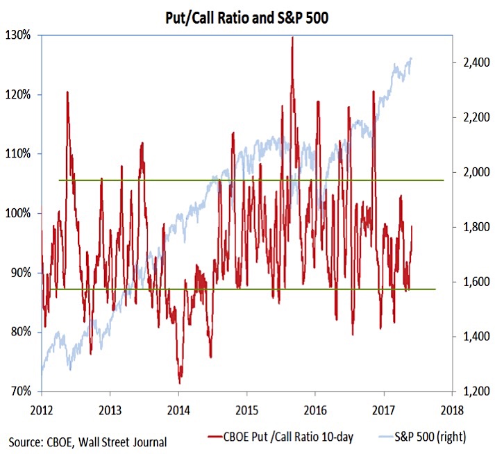 Sentiment surveys continue to offer a mixed bag of evidence. Both the NAAIM and Investors Intelligence surveys this week showed a pullback in bullishness, but optimism remains elevated. The AAII survey again shows more bears than bulls, although if there is euphoria anywhere in that survey it is probably among the neutral respondents (41% this week). What has caught our eye this week as been persistent strong demand for put options. The 10-day CBOE put/call ratio is rising sharply even as stocks move to new all-times highs. The displays a healthy level of skepticism even amid evidence of some degree of optimism in some of the sentiment surveys.