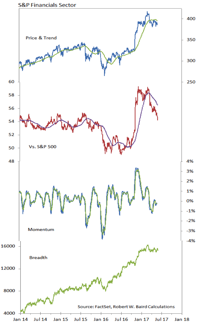 If bond yields do move back toward their early-year highs, the Financial sector could see renewed interest. So far, the trends do not offer much evidence that this will be the case. Breadth in the sector has been relatively strong, but momentum remains in a downtrend (defined by lower highs and lower lows) and price has stalled on an absolute and relative basis. The up-trends that emerged over the course of 2016 do remain intact but got over extended in the fourth quarter of last year.