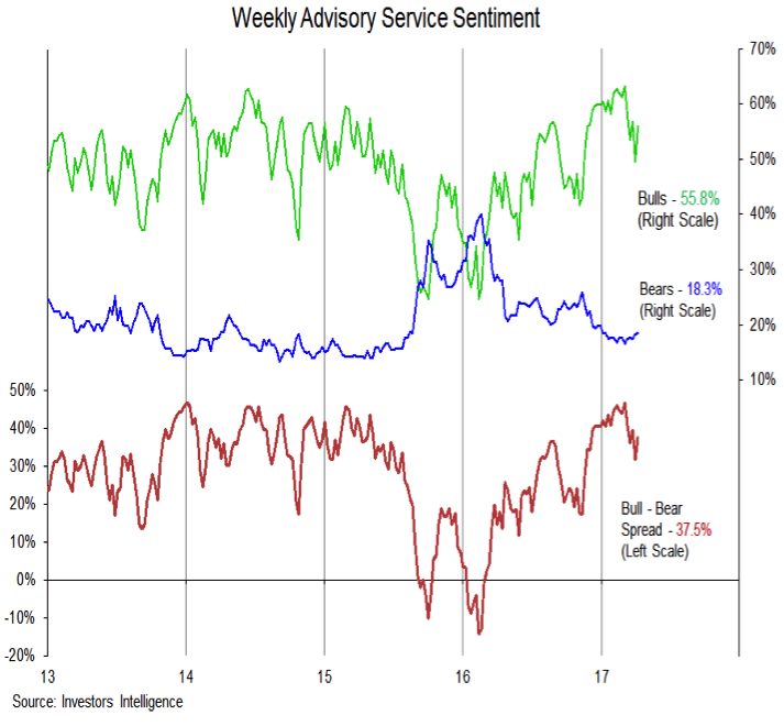 It may not take an overall decline of that magnitude (7%) to get investors more cautious. The NAAM exposure index has already dropped from above 100% to below 70% (a reading below 60% would unwind all the post-election optimism). Likewise, the bull-bear spread on the Investors Intelligence survey of advisory services has begun to contract as bulls have retreated from their early-March peak. A further contract in bulls and, importantly, a rise in bears, could help move the spread back below 20%, which would also indicate an unwinding of the post-election surge in optimism.