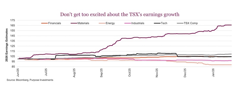 So is the place to be in 2026 Japan, emerging markets and the TSX? We would agree with the first two, but we are a little less enthusiastic about the TSX, largely because of where that earnings growth is coming from. The chart below includes the overall TSX’s 2026 earnings revisions and as you can see it is ‘ALL’ coming from materials, led by gold. No question, gold companies are printing a lot of cashflow. But the market may not pay up much for such volatile earnings.