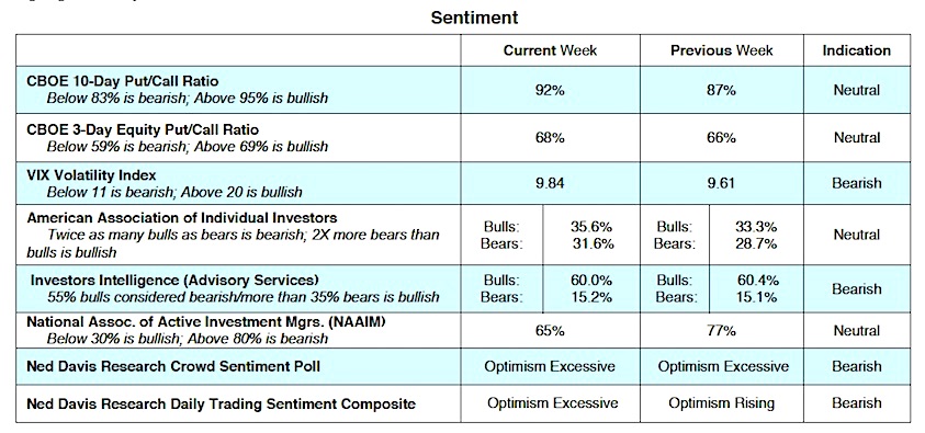Despite the unrelenting rise in stock prices without a meaningful correction, the technical indicators offer little evidence of an impending peak in the market averages. Most equity indices are in harmony with the primary trend and argue that the path of least resistance remains to the upside. Breadth indicators remain bullish overall. The percentage of industry groups within the S&P 500 that are in defined uptrends improved to 78% from 75% the previous week.
