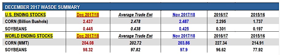 - On Tuesday the USDA released its December 2017 WASDE report, which initially offered some minor price support to the corn market. In that report the USDA raised 2017/18 U.S. corn demand for ethanol by 50 million bushels to 5.525 billion bushels. The net result was a 50 million bushel decrease to 2017/18 U.S. corn ending stocks, which fell to 2.437 billion bushels. This compares to the average trade guess of 2.478 billion bushels and the USDA’s November estimate of 2.487 billion.