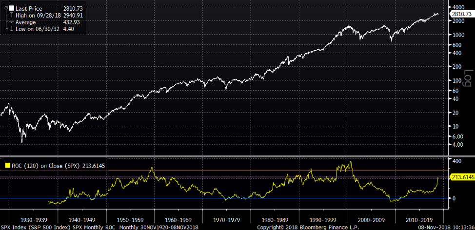 I’ve often shared this chart with clients to show them that even though the market had been in a sustained uptrend in recent years, this rate-of-change often reaches above 300 in extended bull markets.