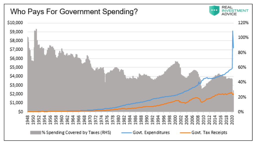 Since 2017, taxpayers have paid for less than half of government expenditures. Over the last six months, as shown below, that percentage has fallen to less than a third.